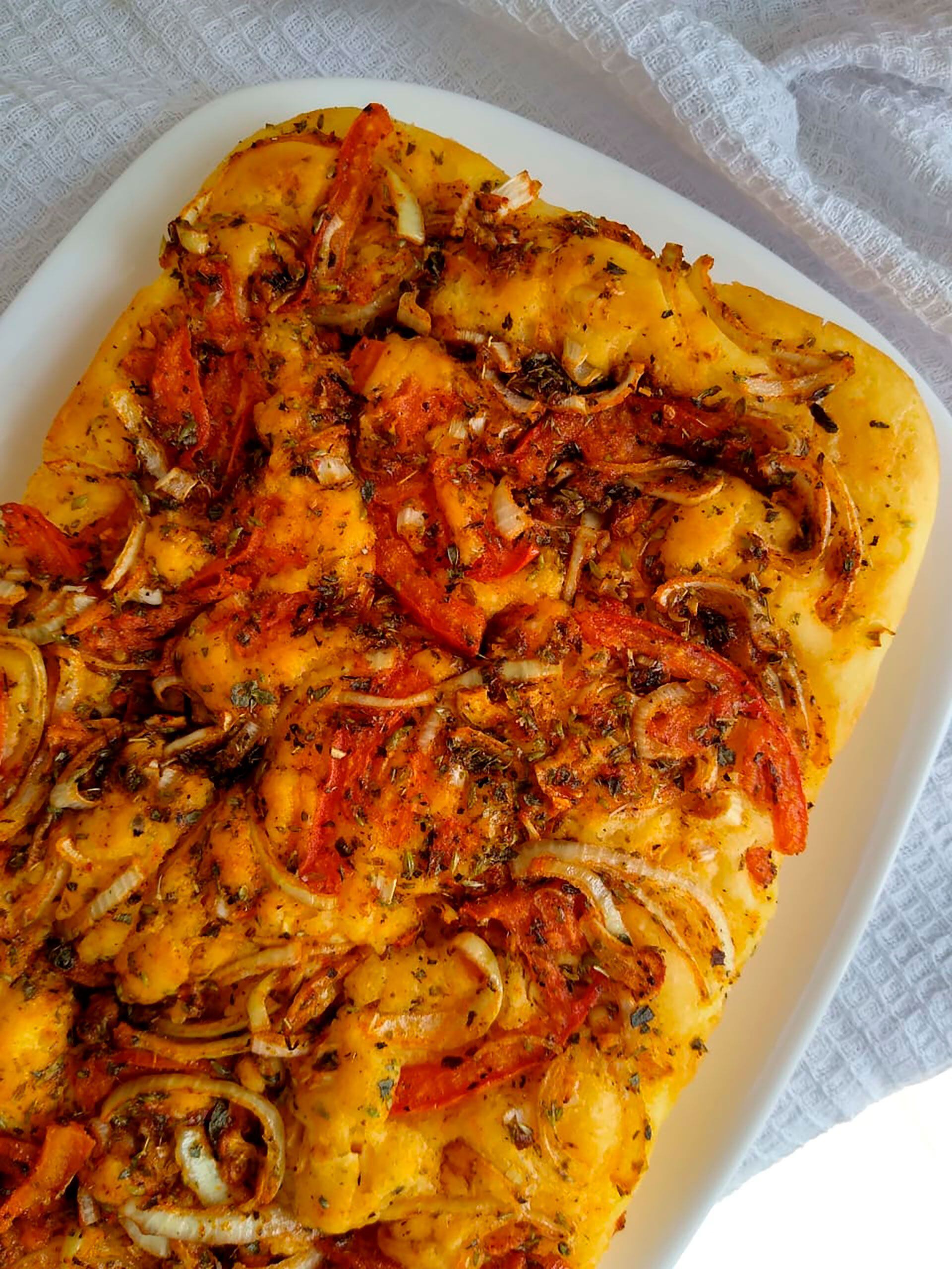 Cortar en juliana la cebolla, el tomate y picar el diente de ajo. Colocar en un recipiente y agregar la sal, el aceite y todos los condimentos, mezclar bien y esparcir arriba de la masa. Dejar levar media hora. Cocinar en horno precalentado a fuego medio(180°) por aproximadamente 30 minutos.