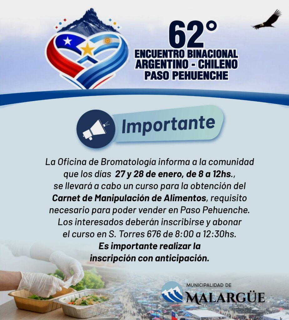La Oficina de Bromatología informó que los días 27 y 28 de enero, en el horario de 8:00 a 12:00 horas, se desarrollará el curso para la obtención del Carnet de Manipulación de Alimentos. La capacitación tendrá lugar en el Campus Educativo y está dirigida a quienes deseen vender alimentos en el Paso Pehuenche, ya que forma parte de los requisitos exigidos por la normativa vigente en materia de higiene y seguridad alimentaria.