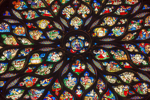Jesus Christ With Sword Surrounded by Biblical and Medieval Stories Angels, Mary Rose Window Stained Glass Saint Chapelle Paris France. Saint King Louis 9th created Sainte Chappel in 1248 to house Christian relics, including Christ’s Crown of Thorns. Stained Glass created in the 13th Century and shows various biblical stories along wtih stories from 1200s.