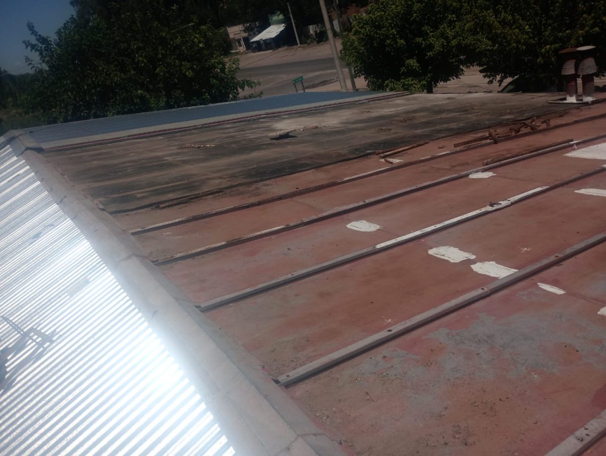Cabe destacar que del techo se sacó parte de las chapas de fibrocemento, se limpió, se colocó refuerzo metálico para poder atornillar las chapas nuevas y luego se realizará la zinguería correspondiente. Respecto del piso, se demolieron paños de hormigón que estaban muy deteriorados y se hormigonaron nuevamente.