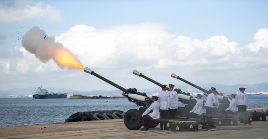 Images show a gun salute held at HM Naval Base in Gibraltar to mark the first anniversary of HRH King Charles assession to the throne.