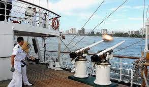 Según el Comando de Historia y Patrimonio Naval,” los primeros guerreros demostraban sus intenciones pacíficas colocando sus armas en una posición que las hacía ineficaces”. Además, antiguamente era costumbre que un barco que entraba en un puerto amigo hacía sonar sus cañones. La tradición de descargar ceremonialmente las armas de un barco ha evolucionado más para mostrar honor que servilismo o un estado de preparación.