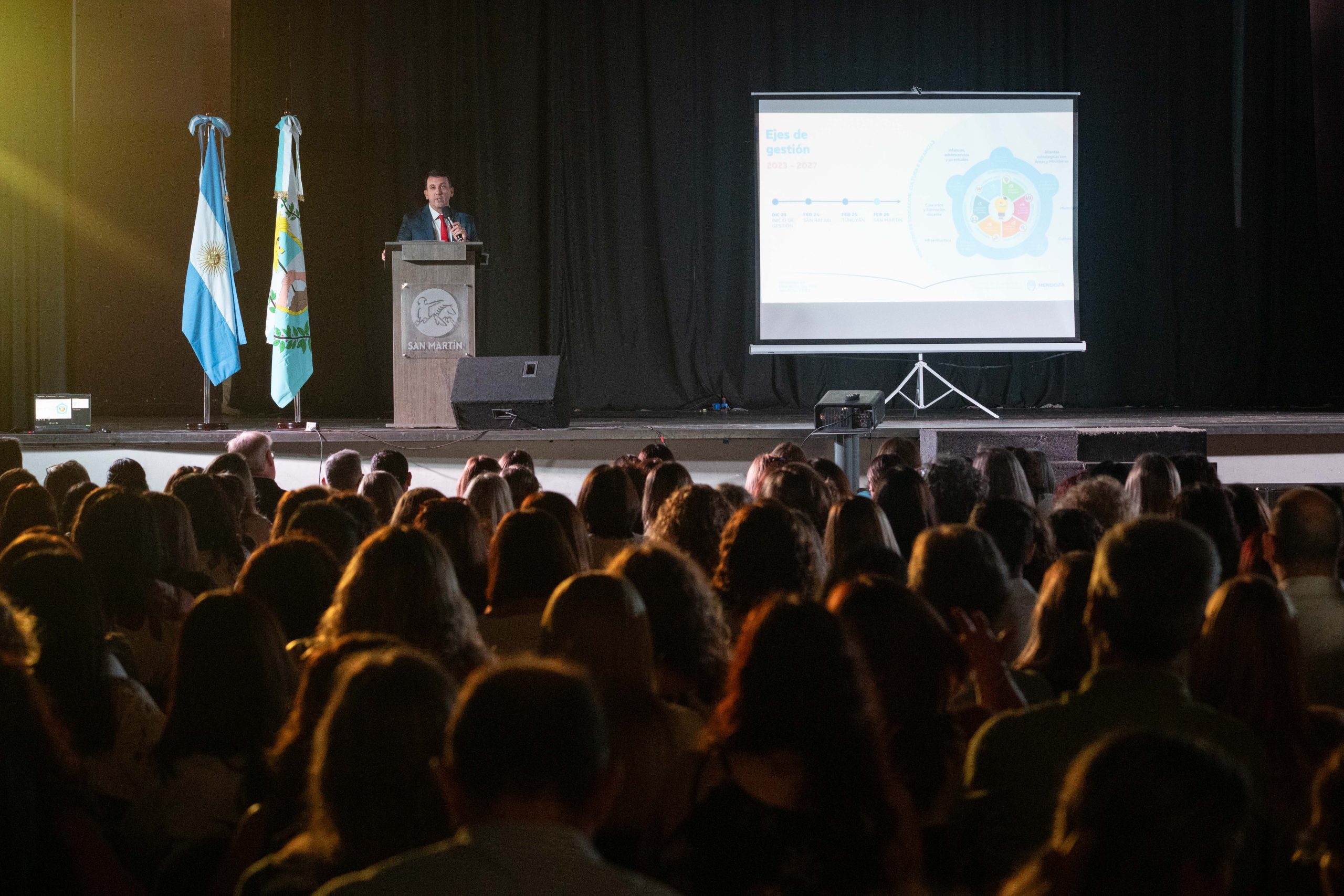 En un acto realizado en el departamento de San Martín, el Gobierno de Mendoza presentó los lineamientos político-pedagógicos que regirán el ciclo lectivo 2026, marcando una hoja de ruta centrada en la alfabetización integral, la innovación tecnológica y el fortalecimiento de las trayectorias escolares. El evento, desarrollado en el Centro de Congresos y Exposiciones Francisco, y encabezado por el ministro de Educación, Cultura, Infancias y DGE, Tadeo García Zalazar, contó con la presencia de la vicegobernadora de la Provincia, Hebe Casado; el intendente de San Martín, Raúl Rufeil; los subsecretarios del Ministerio; todos los directores de la DGE; supervisores y otras autoridades del gobierno escolar. García Zalazar encabezó la presentación de un plan que busca consolidar a la provincia como referente nacional en calidad educativa.