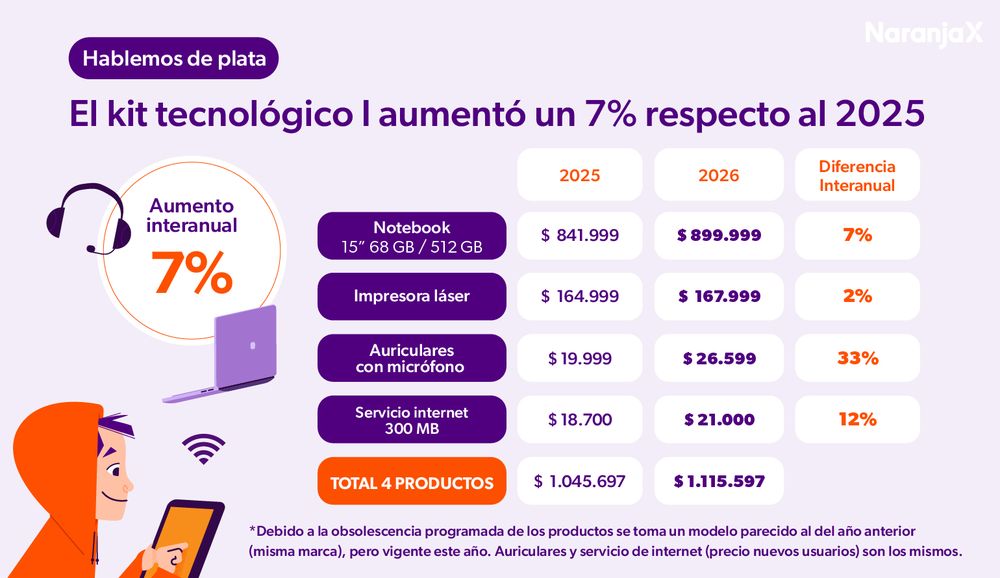 Según el informe, elaborado para el blog de educación financiera de Naranja X, Hablemos de Plata, equipar a un estudiante de primaria demanda entre $120.000 y $243.000, dependiendo de la calidad y el tipo de productos elegidos. En secundaria, el conjunto básico ronda los $96.000, aunque la cifra escala de manera significativa cuando se incorporan dispositivos tecnológicos.