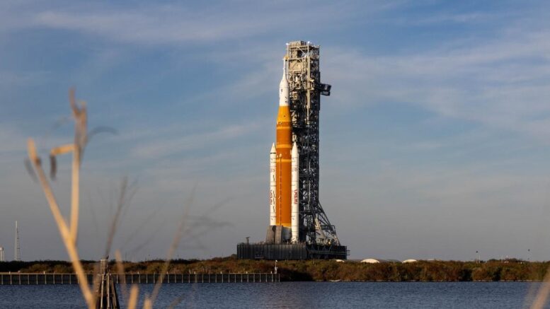 El cohete SLS y la nave Orión, en la plataforma de lanzamiento del Centro Kennedy de FloridaEl cohete SLS y la nave Orión, en la plataforma de lanzamiento del Centro Kennedy de FloridaNASA